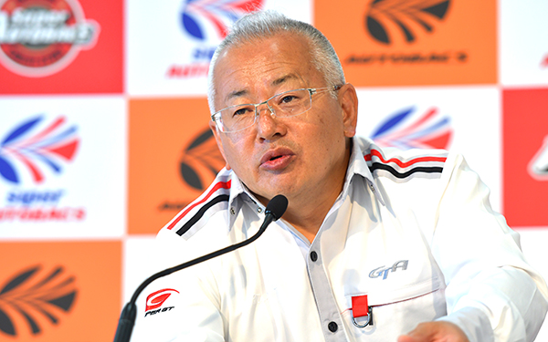 On the morning of April 4, the regular press conference of GTA Co., Ltd., administrative body of SUPER GT, was held at Fuji Speedway, site of Round 2 of the 2016 AUTOBACS SUPER GT. At the conference, GTA Chairman Masaaki Bandoh answered questions asked by a representative of the Japan Motorsport Journalist Society (JMS) about the situation involving the postponement of Round 3 of the SUPER GT series, the Autopolis Round, and also to reflect on the opening round of the series at Okayama. The Chairman also answered individual questions about the Steering Committee meeting scheduled for May 11.