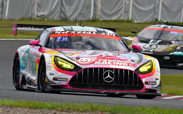 Entering the second half of the race, car No. 5 was technically in the lead, but having changed all four tire, car No. 244 had a faster pace and had closed the gap. The two cars battled head-to-tail for 10 laps. And while this duel was going on, car No. 88 (Kogure) caught up to make it a 3-way fight. Reiji [Hiraki] in car No. 5 was battling hard to take the win, but on the 38th lap, Tsutsumi in car No. 244 finally passed him. Then, on lap 39, car No. 88 also passed No. 5. And now, Taniguchi in the No. 4 GOODSMILE HATSUNE MIKU AMG (Nobuteru Taniguchi/Tatsuya Kataoka) was closing in on No. 5. Perhaps it was this pressure that caused No. 5 to spin out at the Degner Curve on the 43rd lap, thus putting No. 4 in position for a podium finish.