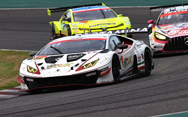 During the 20-minute warm-up session before the start of the race, the right front tire of the No. 18 UPGARAGE NSX GT3 (Takashi Kobayashi/Teppei Natori) came off, causing the car to crash violently at the 130R curve. The driver Natori wasn’t injured but car No. 18 was unable to take part in the race. This reduced the number of GT300 class competitors to 28 and caused a 10-minute delay in the Rd. 3 race at Suzuka to 2:40 in the afternoon. At the GT300 class start, the pole position No. 61 SUBARU BRZ R&D SPORT (Hideki Yamauchi) went through the first turn in the lead. No. 61 was followed by the 3rd position grid starter, the No. 244 Takanoko-no-yu GR Supra GT (Atsushi Miyake) and the No. 9 PACIFIC NAC CARGUY Ferrari (Kei Cozzolino) that had made a fine dash up from 5th position on the grid. The No. 5 MACHSYAKEN GTNET MC86 MACH GO (Yuya Hiraki) that had started from the 2nd grid spot was dropped back to 4th position by these charges, while the No. 88 JLOC LAMBORGHINI GT3 (Yuya Motojima) followed in 5th. On the fifth lap of the race, the leading GT500 car crashed on the Hitachi Astemo Chicane. This brought a Full Course Yellow (FCY) and then the Safety Car also came out. During the Safety Car run, eight of the GT300 cars back in the middle of the pack made their pit stop and changed tires. When the race was restarted on the 12th lap of the race, the leading car No. 61 was unable to pick up the pace and soon being hunted down by cars No. 244 and No. 9. At the Dunlop Corner of the13th lap these two cars passed the leading No. 61. With this a battled for the lead ensued between No. 244 and No. 9. After the 20th lap of the race, the lead group cars began to make their routine pit stops. The No. 5 MACHSYAKEN GTNET MC86 MACH GO that had been running in 4th position made its driver change from the Hiraki brothers Yuya to Reiji, while the team decided to save time by foregoing a tire change. As for the leading No. 244 Takanoko-no-yu GR Supra GT, it made its pit stop at the end of the 24th lap and changed drivers from Miyake to Tsutsumi.