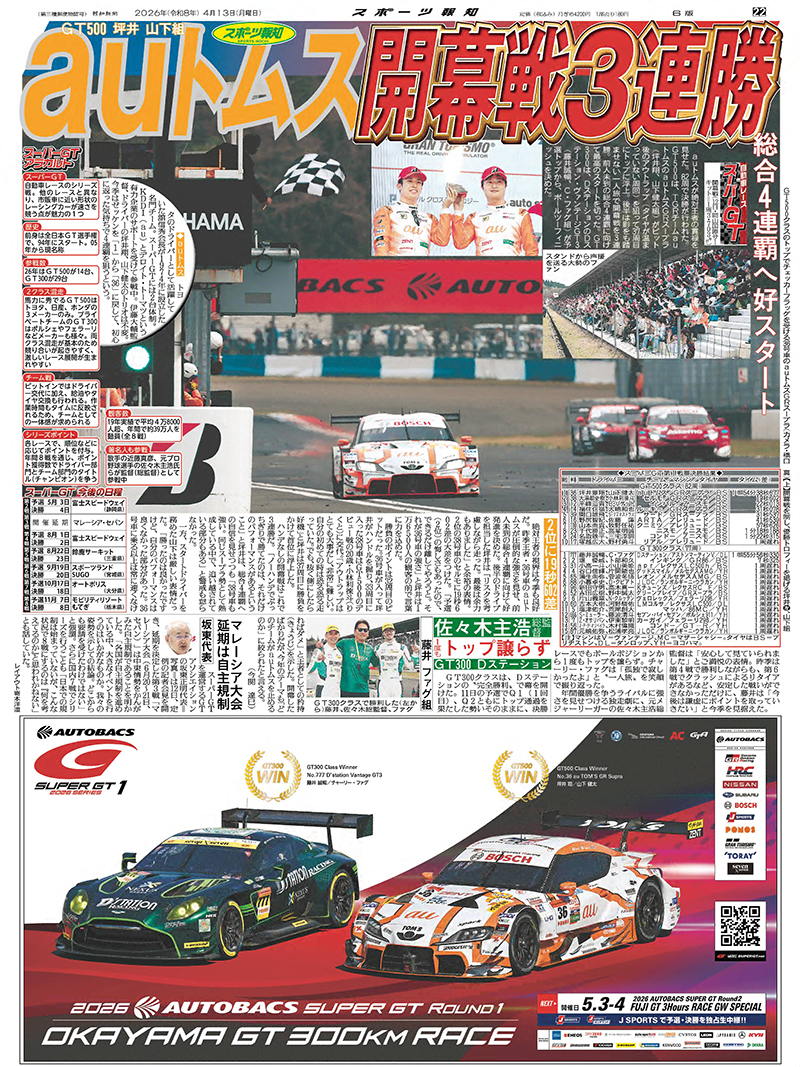 4月12日、2026 AUTOBACS SUPER GT 第1戦『OKAYAMA GT 300km RACE』が、岡山県の岡山国際サーキットで行われ、GT500では昨年のチャンピオンであるNo.36 au TOM’S GR Supra(坪井翔/山下健太)が今季の初優勝を遂げ、開幕戦での3連勝を果たした。この勝利と、GT300クラス優勝のNo.777 D’station Vantage GT3(藤井誠暢/チャーリー・ファグ)がスポーツ報知・全国版の最終面を飾っているので、コンビニや売店などで購入してみてはいかがだろうか。