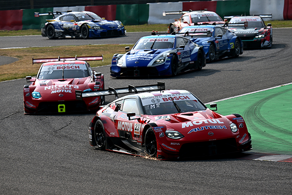 迎えたモビリティリゾートもてぎでの最終戦。開幕戦、第4戦の2レースと同様にノーウェイトで行われ、予選はQ1で24号車の名取が2位、4、5位に23号車と3号車、10位に12号車と全4台がQ2に進出。Q2でも3〜6位に23号車、12号車、3号車、24号車と上位に並んだ。これは中盤戦以降のセッティング変更、オートポリスで投入されたスペック2のエンジン、そしてNISMOの2台はブリヂストンタイヤへの理解が深まった結果だろう。