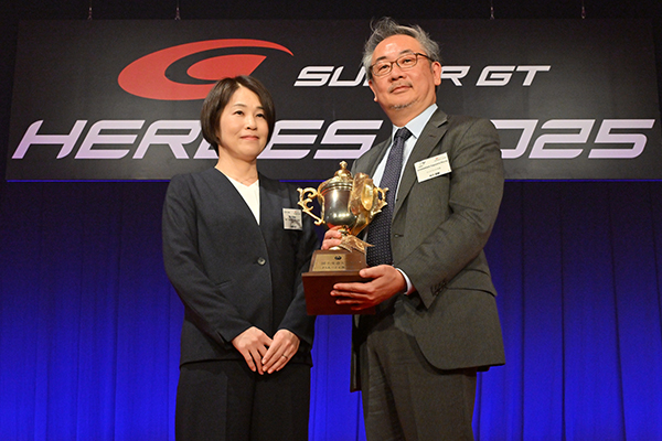 GT300クラスのGT300規定車両及びGT300マザーシャシー規定車両の最上位のチームに贈られる国土交通大臣杯は、No.52 埼玉Green Braveが獲得し、国土交通省の小磯和子課長より丸山恵介監督に授与された。続いて2025シーズンチャンピオンチームに贈られる“GTA PRIZE”のそれぞれの車両のクリスタルとSUPER GTカップ、副賞の伊勢エビが、坂東代表よりTGR TEAM au TOM’Sの伊藤監督とK2 R&D LEON RACINGの黒澤監督に贈呈された。