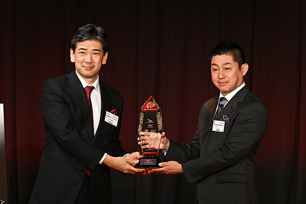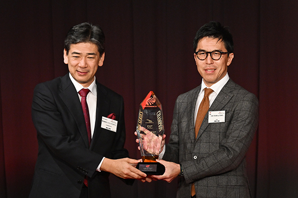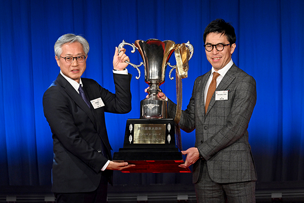 史上初の3年連続GT500クラス・チームチャンピオンを勝ち得たNo.1 TGR TEAM au TOM’Sの伊藤監督には、光輝く大杯“経済産業大臣杯”が経済産業省 製造産業局担当の田中一成 氏より授与された。