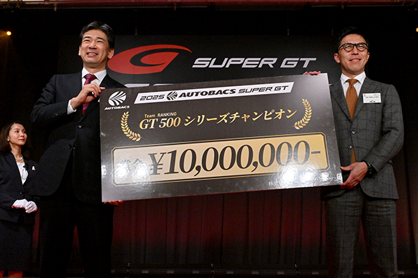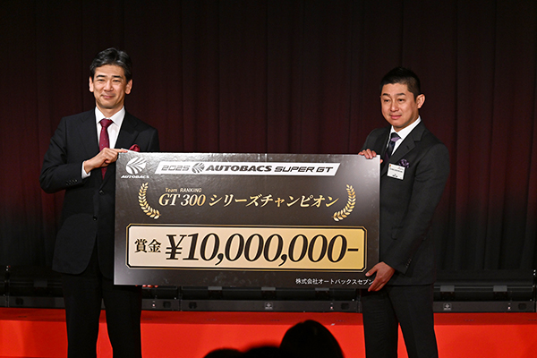 そして表彰式もSUPER GTの部門を迎える。壇上に上がったチームランキングの1位を獲得したGT500クラスのNo.1 TGR TEAM au TOM’S(伊藤大輔監督)と、GT300クラスのNo.65 K2 R&D LEON RACING(黒澤治樹監督)には“オートバックス賞”のトロフィーと賞金1千万円が株式会社オートバックスセブンの堀井勇吾 代表取締役社長より贈呈された。また、ランキング2、3位であるGT500クラスのNo.100 TEAM KUNIMITSU(小島一浩 監督)、No.39 TGR TEAM SARD(脇阪寿一 監督)、GT300クラスのランキング2、3位であるNo.56 KONDO RACING(阿立信昭モータースポーツ事業部技術統括)、No.4 GOODSMILE RACING & TeamUKYO(片山右京 監督)には、それぞれにオートバックス賞のトロフィーが授与された。