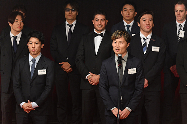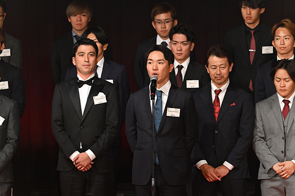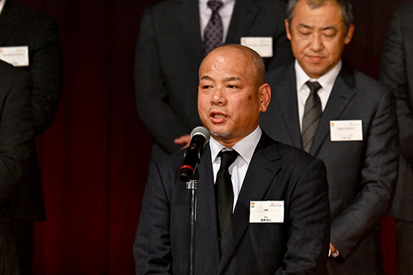 「今年1年、SUPER GTを円滑に運営して頂き、ありがとうございました。エントラント代表として主催サーキット、クルマやタイヤの各メーカー、メディア、シリーズプロモーターであるGTA、そしてもちろんファンの皆さん、本当にありがとうございました。実は用意していたお話ではなく、壇上に上がってくる際に思い立ったお話をさせていただきます。SUPER GTではチームやドライバー、あるいは自動車メーカーやタイヤメーカーのエンジニア。全員が速さを求めて悩み、壁に突き当たってもがき、それを克服しようとがんばっています。そしてその結果、SUPER GTのプロ化が進んできたと思います。今やSUPER GTは世界最高峰のレース、高い位置で戦っています。でもまだまだ満足できていないのはSUPER GTに限らずモータースポーツの認知度が上がってこないこと。例えば、メジャーリーグや国内のプロ野球に比べると明らかでしょう。そのために今年は、ここにお集まりの皆さんと共に、一日一善ならぬ一日一気遣いをして行こうと思います。サインするなら並んでくれた最後の一人まで。ファンと握手する時には両手で。そうしたちょっとした心遣いで誰にとっても、私たち自身の心までも満足します。そしてそのことで、モータースポーツの認知度も高まっていくと思います。来年は、“一日一気遣い”を心掛けながら、SUPER GTの、ひいてはモータースポーツの知名度を上げていきましょう」と、SUPER GTやモータースポーツの知名度と地位の向上を訴えた。