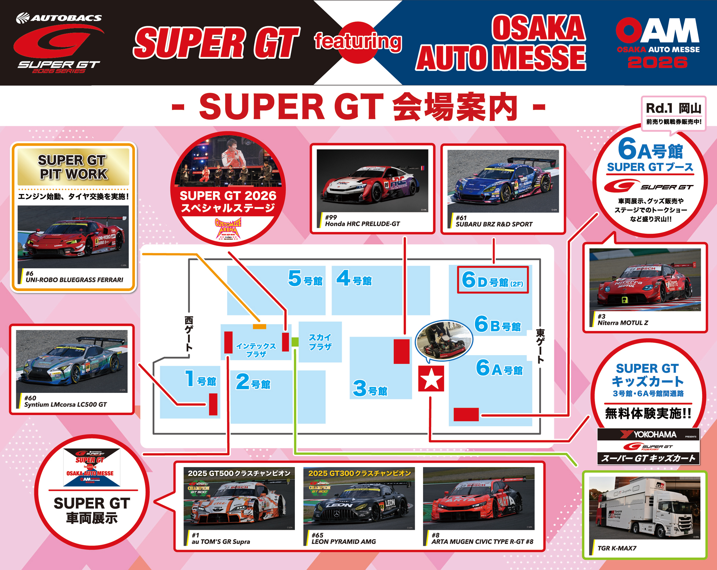 大阪オートメッセ開催中はインテックスプラザのメインステージで毎日1回、「SUPER GT 2026スペシャルステージ」を実施します。GT500クラスでNo.1 au TOM’S GR Supraを駆り2025年チャンピオンを獲得した坪井翔選手(参加15日)と山下健太選手(同13日)に、この1号車と熾烈な勝負を演じた大津弘樹選手(No.16 ARTA MUGEN CIVIC TYPE R-GT #16/同13、14日)、高星明誠選手(No.23 MOTUL AUTECH Z/同13、14日)、そしてGT300クラスの2026年チャンピオンである菅波冬悟選手(No.65 LEON PYRAMID AMG/同15日)と、昨年1勝を挙げた片山義章選手(No.6 UNI-ROBO BLUEGRASS FERRARI/同13、14、15日)がステージで昨年の裏話や今季開幕前の状況などを語ってくれる。