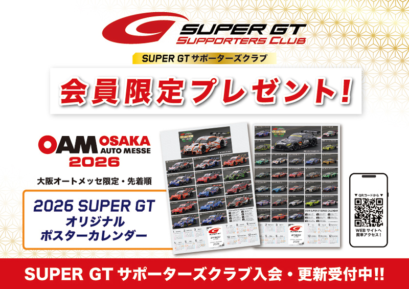 サポーターズクラブ入会キャンペーンとして、大阪オートメッセの会場限定で「GT500またはGT300のB2ポスター カレンダー」を会員プレゼントとしてご用意しております(無くなり次第終了)。