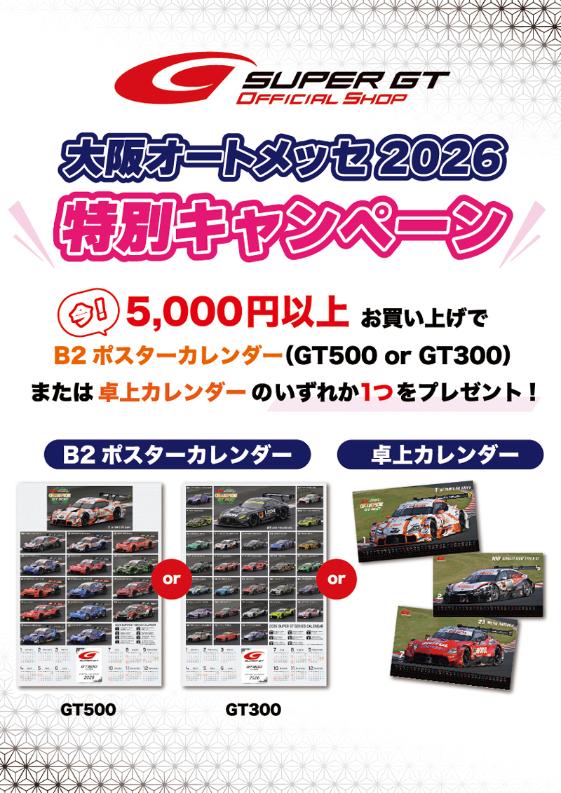 5,000円(税込)以上のお買い上げで、非売品のGT500またはGT300のB2ポスターカレンダーを1枚またはGT500卓上カレンダーを1つプレゼントいたします。ぜひこの機会にお買い物をお楽しみください。