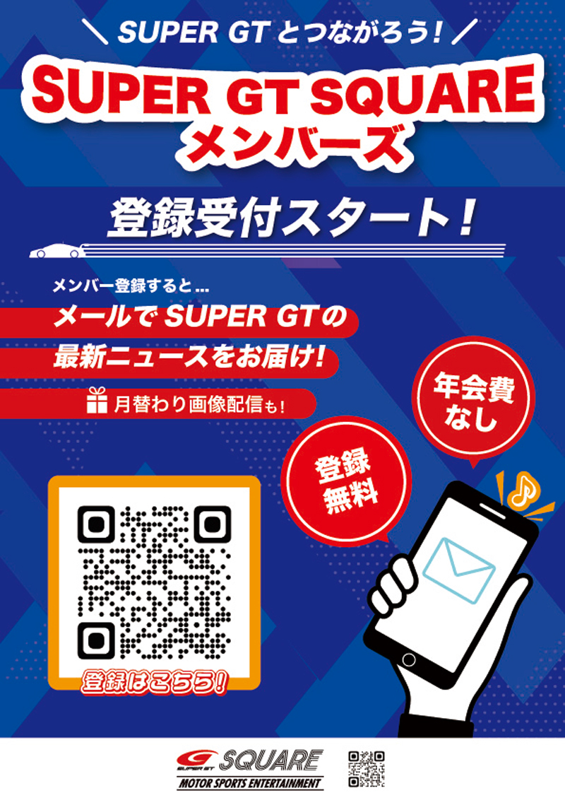 SUPER GTブースでは、新たにスタートする「SUPER GT SQUAREメンバーズ」の登録案内も実施いたします。SUPER GT SQUAREメンバーズは、SUPER GTの最新情報やイベント情報、キャンペーン情報などをメールでお届けする無料の公式メンバーシップです。