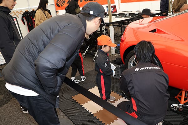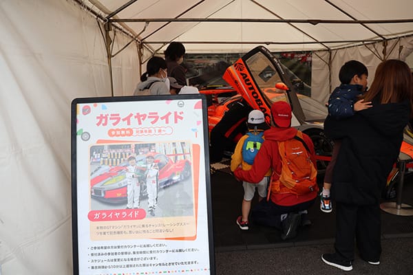 またSUPER GTのシリーズタイトルスポンサーであるオートバックスもブースを出展。そのブースの1つは「コドモバックス」と命名され、2012年までGT300クラスに参戦していたNo.43 ARTA Garaiyaを使ってのキッズライドや、ガライヤ(試作車)でのキッズの「タイヤ交換体験」などが行われ、親子の笑顔があふれていた。