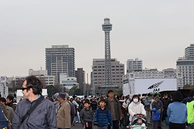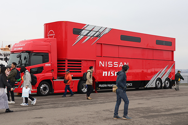 横浜の観光名所でもある山下公園から山下ふ頭の会場に入ると、SUPER GTのパドックでお馴染みのNISSAN/NISMOがお出迎え。NISMOのサーキット用オフィスである「N-FORCE」が展示されていた。このトレーラーの荷室にはデータ分析ルームや会議室も備えており、NISSAN陣営のサーキット前線基地である。ベースはレースカーを運ぶ大型トランスポーターなので、ここで初めて見る来場者からは「意外と大きいね」といった声も聞かれた。