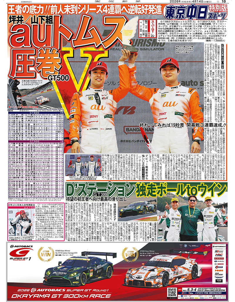 2026 AUTOBACS SUPER GTの開幕戦となる『OKAYAMA GT 300km RACE』で、GT500クラスのNo.36 au TOM’S GR Supraが4連覇に向けて勝利を挙げた。GT300クラスではNo.777 D’station Vantage GT3(藤井誠暢/チャーリー・ファグ)が独走でポール・トゥ・ウィンを達成。この両チームが14日付の東京新聞に掲載されている。コンビニや売店などで購入してみてはいかがだろうか。