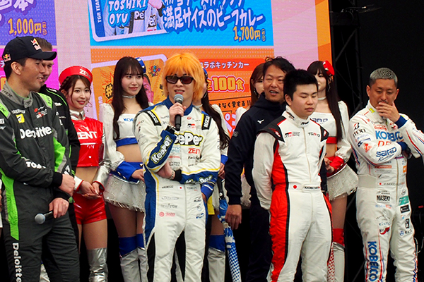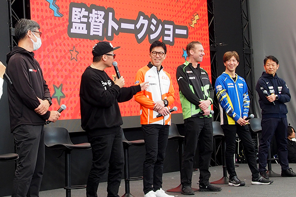 オープニングセレモニー後、ステージには14号車の武田敏明監督、19号車の坂東正敬監督、今年は1号車改め36号車の伊藤大輔監督、37号車のミハエル・クルム監督、38号車の立川祐路監督の監督5人と39号車の近藤尚史代表が登壇して、トークショーが行われた。