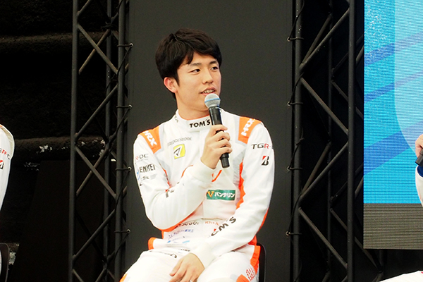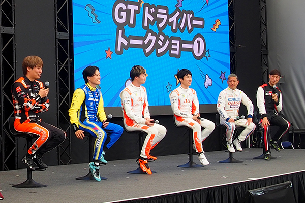 この日、1回目のドライバートークショーは大嶋選手、国本雄資選手、坪井翔選手、山下健太選手、関口雄飛選手、そしてGT300クラスの石浦宏明選手の6選手が出演。トークテーマは「今シーズン“挑戦”してみたいこと」だ。