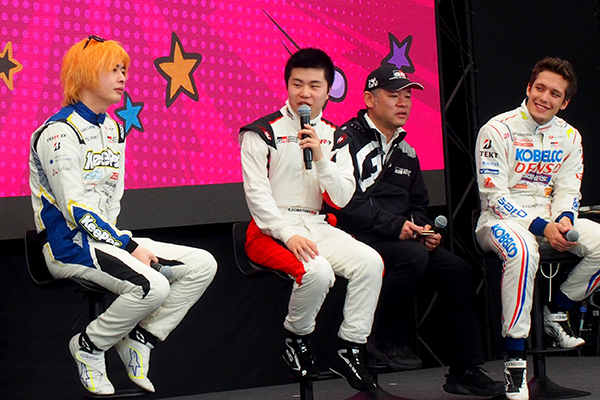 まずはファンがこの日投稿したリクエストが紹介され、5歳の子どもからの「一緒に塗り絵をやりたい」に対し「子どもとの距離が縮まりそうで、ぜひやってみたい」(笹原)、「ドライバー一絵心がない坪井君も一緒に」(阪口)など盛り上がった。続いて大湯選手がセパンでのテストの合間に小林選手が今年使用する新ヘルメットペイントのデザインを色鉛筆で描いていたことを暴露し、披露される開幕戦が楽しみと言う。その他「東北でもフェスタやってほしい」「綱引きがやりたい」などのリクエストにも、ドライバー達は前向きに答えた。