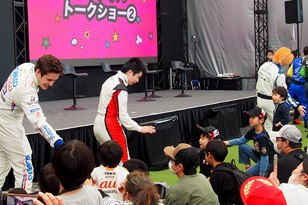 またドライバーからのリクエストとして阪口選手が「(人気番組の)“逃走中”をやりたい」、笹原選手の「GT500のマシンに助手席をつけファンの皆さんに同乗してもらって、市街地を走ってみたい」には、来場のファンも大賛成のリアクションだった。