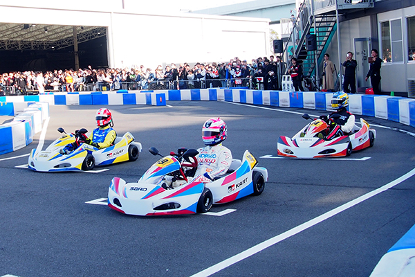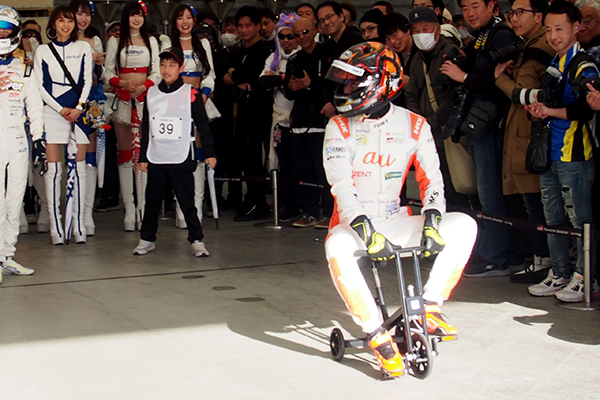 この日最も盛り上がりを見せたのはやはり、TGRドライバー同士のカート勝負だった。SUPER GTのレースと同じように2人のドライバーが途中交代して6周するというもの。だが、ひとつ違うのがドライバー交代でピットインする際、それぞれのチームのキッズサポーターと後半スティント担当のドライバーによる三輪車対決を挟まなければならないこと。