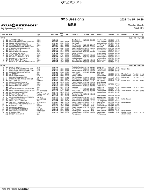 【公式テスト富士】走行2回目/1日目総合結果