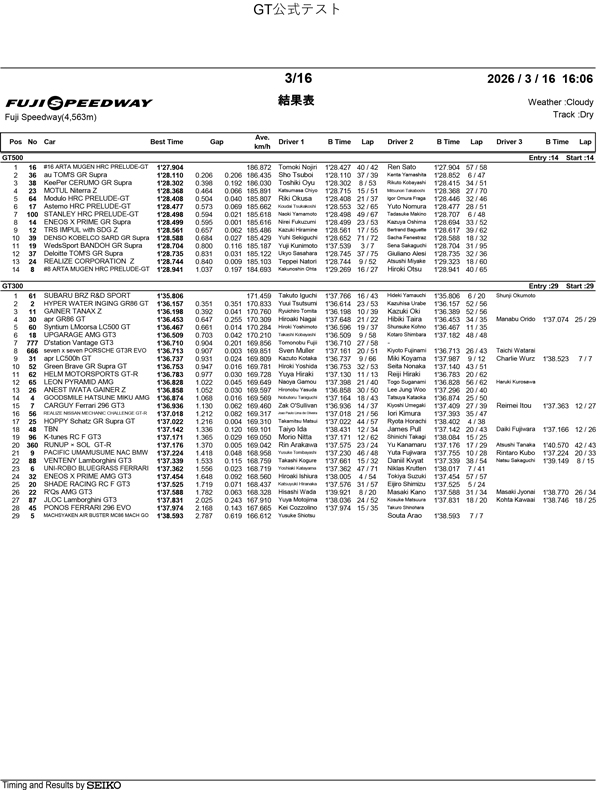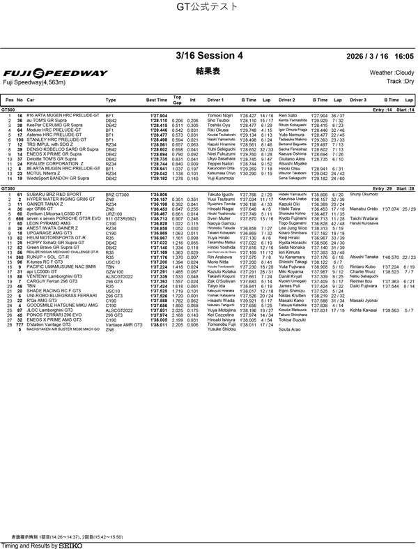 【公式テスト富士】走行4回目/2日目総合結果