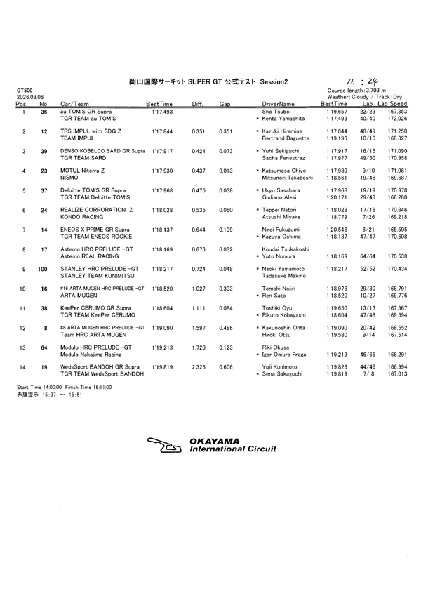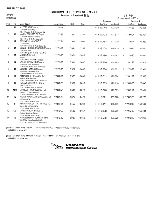 【公式テスト岡山】GT500走行2回目/1日目総合結果