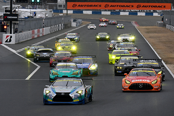 そして午後1時45分からはスタート練習となり、各クラスの車両がダミーグリッドにつく。前日のクラス総合トップだったNo.36 au TOM’S GR SupraとNo.60 Syntium LMcorsa LC500 GTがポールポジションにつく。セーフティカー先導のもとフォーメーションラップを行なってスタートを切ると、そのままセッション4が開始。このセッション4は天候が目まぐるしく変化し、スタート練習時にはどんよりと立ち込めた雲からパラパラと雨が落ちる。セッション3に続きウェット宣言が出される中、各車が精力的に周回していく。