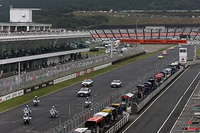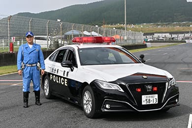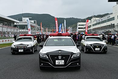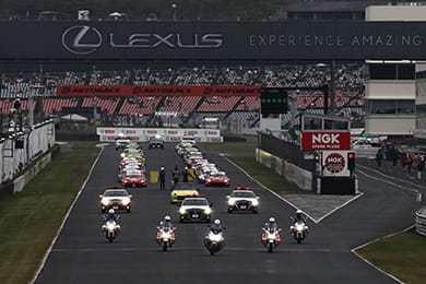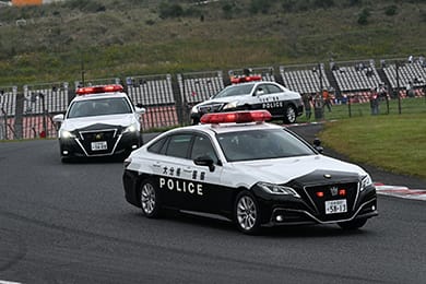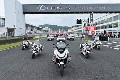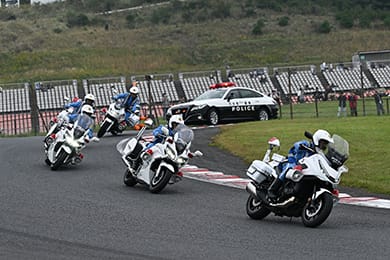 そして、今大会での交通安全啓発活動の締めくくりとして、決勝スタート時のフォーメーションラップを前に、白バイ5台とパトロールカー3台がレースを直前に控えた41台のマシンを先導してコースを1周するパレードラップを実施。赤色灯を回し、サイレンを鳴らしながら、8台の警察車両が美しい隊列でSUPER GTマシンを牽引した。