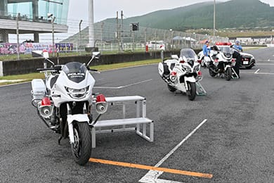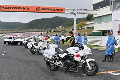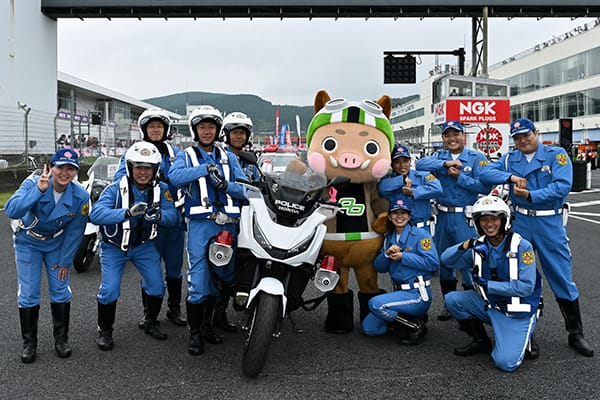 また、決勝レース前に行なわれたスタートセレモニー時にはグリッドの先頭に5台の白バイと3台のパトロールカーを並べ、今大会の啓発活動に参加した隊員たちがオートポリスのゆるキャラ“ポリ坊”と一緒に、オートポリスのロゴを模したポーズで記念撮影、パレードラップを前に緊張していた隊員たちの間に笑顔が広がった。