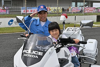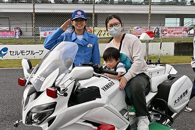 午前10時10分から始まったピットウォーク時には白バイ3台とパトロールカー1台を展示し、乗車体験を実施。白バイにまたがるお子さまとともに記念撮影に応じるなど、乗車体験をとおしてSUPER GTファンと交流を図る隊員の姿が見られた。
