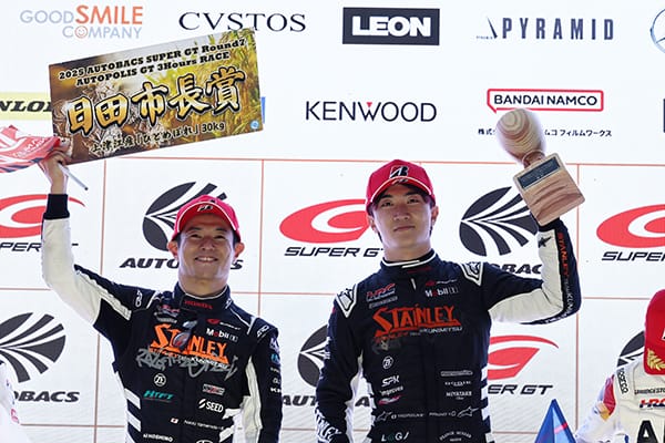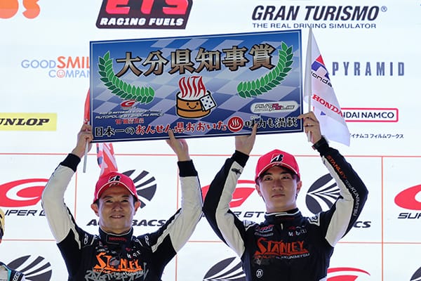 GT500クラスのウィナーであるNo.100 STANLEY CIVIC TYPE R-GTの山本尚貴、牧野任祐両選手には、『大分県知事賞』として「おおいた和牛サーロインステーキ」と日田の豊富な水源と寒暖差の激しい気候によって引き出される豊かな甘みが特徴の「日田梨・新興」のプレゼントボードが、大分県西部振興局 局長 小野高寛様から手渡されました。