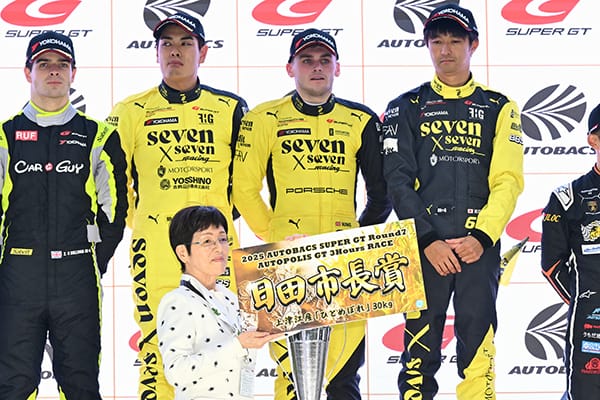 また、『日田市長賞』として、GT500クラスウィナーの山本、牧野両選手とGT300クラスのウィナーとなったNo.666 seven x seven PORSCHE GT3Rのハリー・キング、藤波清斗、近藤翼の3選手には、大分県・上津江産『ひとめぼれ』30kg、そして日田杉で作られた『特製トロフィー」が、日田市市長 椋野美智子様より贈られました。