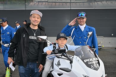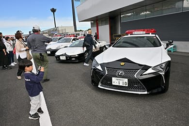 SUPER GTではレースを開催するサーキットの地元警察の協力を得て、決勝日のピットウォークを利用しての交通安全啓発活動や、決勝スタート時のパレードランを行なっている。多くの観客が参加したピットウォークを活用し、ピットロードに栃木県警察のパトロールカーを展示。レクサスLC、スバル・インプレッサ、日産GT-R、日産フェアレディZ、ホンダNSXと異なる車種のパトロールカーが勢揃いしたこともあり、写真を撮る人が多く見られた。また、お子さまと一緒に参加したファミリーのなかには、白バイにまたがってポーズを取る様子を撮影する親御さんの姿もあった。一方、啓発活動の一環としてリーフレット等が配布された。