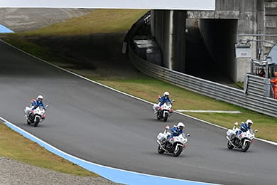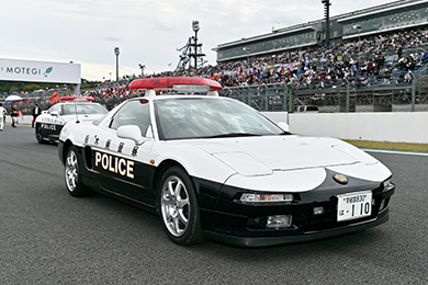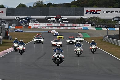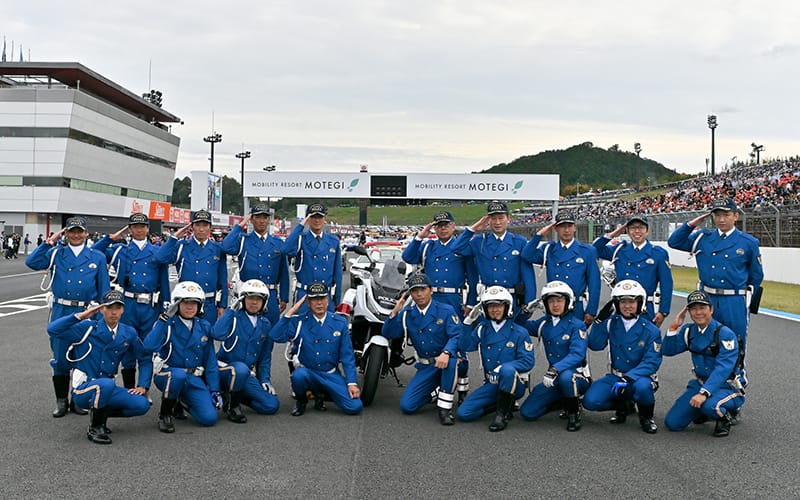 そして決勝レーススタート前にはパレードラップが行なわれ、白バイとパトロールカーがそれぞれ5台ずつ隊列を組み、最終戦を戦う42台のSUPER GT車両を先導。赤色灯を回してサイレンを鳴らしながらモビリティリゾートもてぎのコースを1周し、詰めかけた観客に向けて「交通安全啓発活動パレードラップ」を行なった。