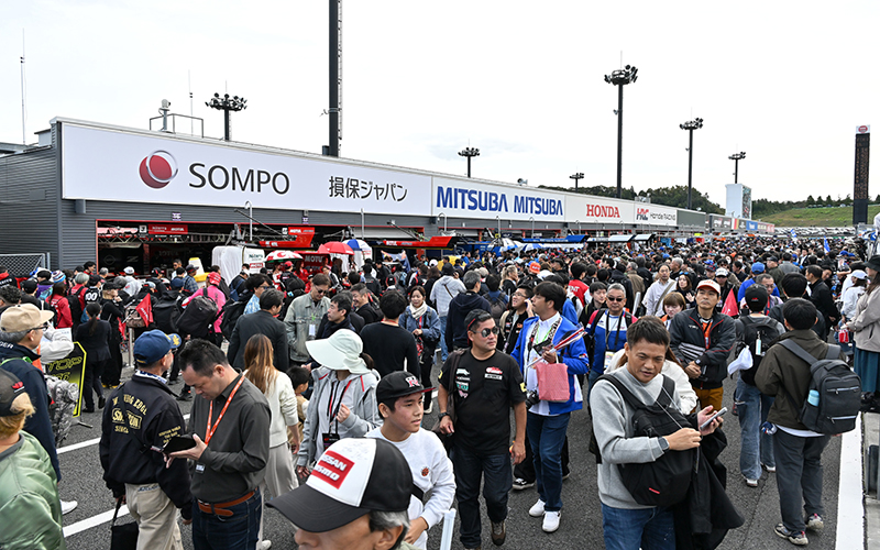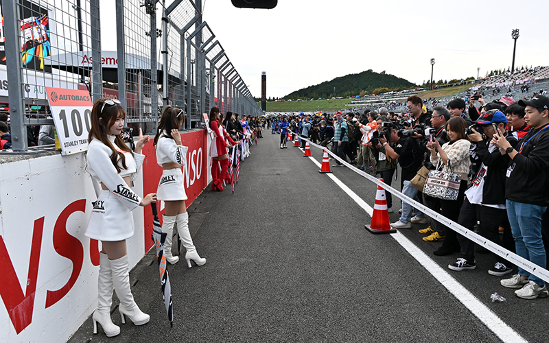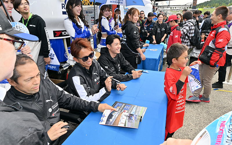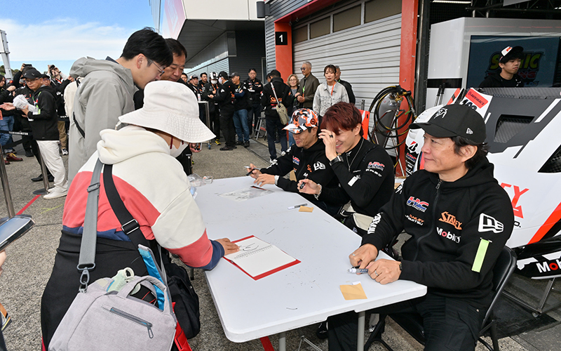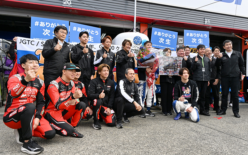 ピットウォークに参加されたファンのみなさんの前で、今大会を最後にSUPER GTから引退する松田次生選手(No.56 リアライズコーポレーション ADVAN Z)の引退セレモニーが行なわれ、近藤真彦監督&名誉NISMOアンバサダーの柿元邦彦氏からそれぞれ花束が、日産モータースポーツ&カスタマイズ株式会社 代表取締役兼最高経営責任者の真田 裕社長から記念品が贈られました。また、セレモニーにはSUPER GTに参戦するドライバー仲間やスタッフも集まり、最後は記念撮影をパチリ。松田選手を囲む、穏やかな笑顔が見られました。