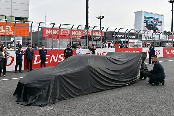 多くの来場者で賑わったピットウォークが終わり、コース上にはヴェールで包まれたクルマの姿があります。その傍らにはレーシングスーツを着て牧野任祐選手が立っており、これから来シーズンのGT500クラスでのデビューが発表されたプレリュードGTのデモランが始まります!