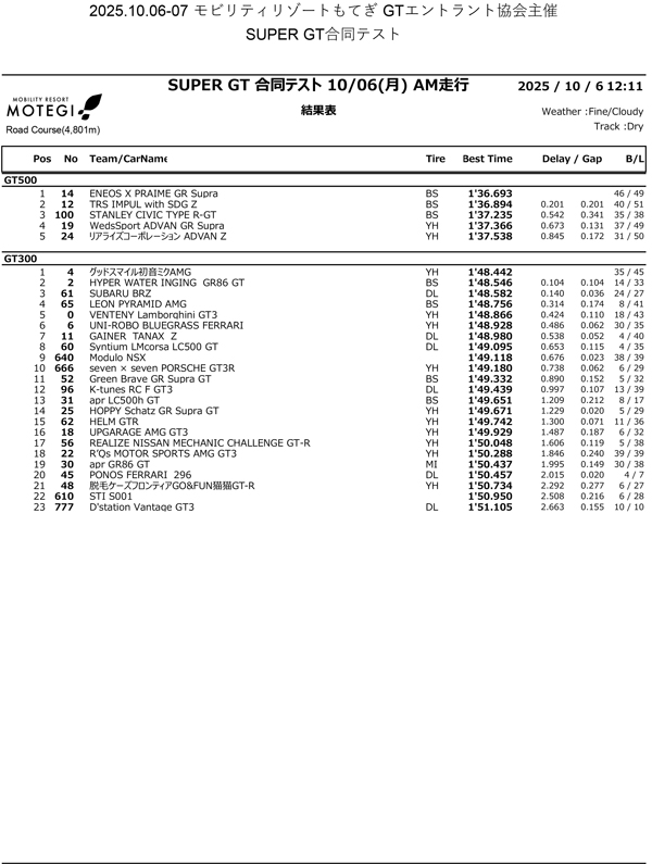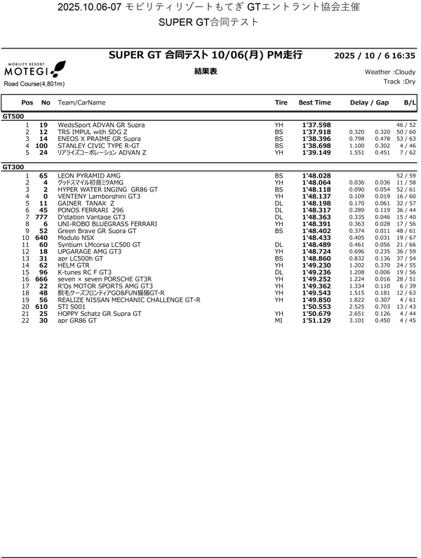 GT500クラスは、阪口晴南がドライブしたNo.19 WedsSport ADVAN GR Supraが1分37秒598でトップに。No.12 TRS IMPUL with SDG Zが1分37秒918で2番手。3番手にはNo.14 ENEOS X PRIME GR Supraが1分38秒396で続いた。なお今回参加したGT500クラスのうち、No.19 WedsSport ADVAN GR Supraを除く4台はこの日限りの参加となっている。