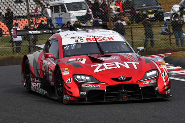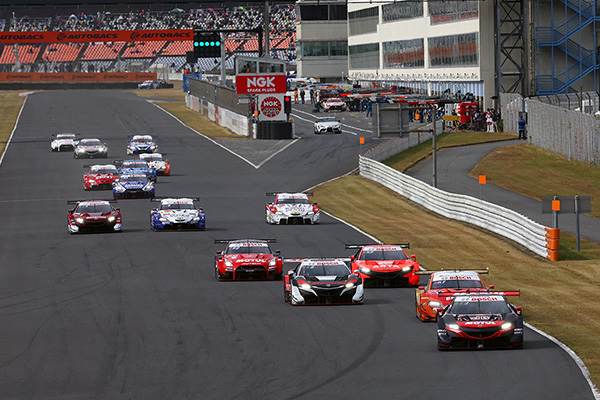スタート自体ではポールポジションのNo.16 Red Bull MOTUL MUGEN NSX-GT(笹原右京/大湯都史樹)が先頭を守るが、日立Astemoコーナー(第1ヘアピン)でそのインを2番手スタートのNo.14 ENEOS X PRIME GR Supraが突いてトップを奪取する。しかし14号車は前戦後にエンジンのトラブルが見つかったため、今季3基目に載せ替えた。規定では年間2基までと定められている。そのペナルティとして決勝で5秒のピットストップとなり、後退を余儀なくされた。14号車以外にNo.37 KeePer TOM'S GR SupraとNo.38 ZENT CERUMO GR Supraも同様の理由でピットストップ5秒を行った。