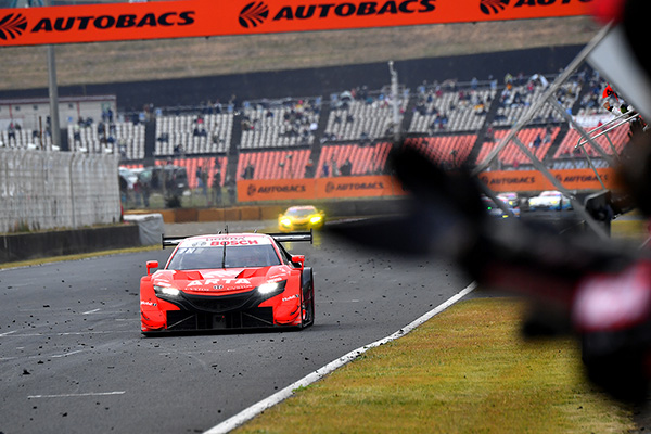 これで64号車と8号車のトップ争いになった。さらに19周目にはGT300の48号車がクラッシュし、2度目のセーフティカーが入る。24周終わりで退去すると、4番手のNo.39 DENSO KOBELCO SARD GR Supraや9番手のNo.1 STANLEY NSX-GTがピットインしてドライバー交代など所定の作業を行う。この後に各車がピットイン。上位陣の最後に64号車がピットイン。トップのままコースに戻るが、タイヤが十分に温まらない状況で8号車(野尻智紀)、39号車、1号車に相次いで抜かれる。だが、タイヤのグリップが出た64号車は2台を抜き、トップの8号車の背後に。そして2台のHonda NSX-GTは3番手以降に大きな差をつけた。