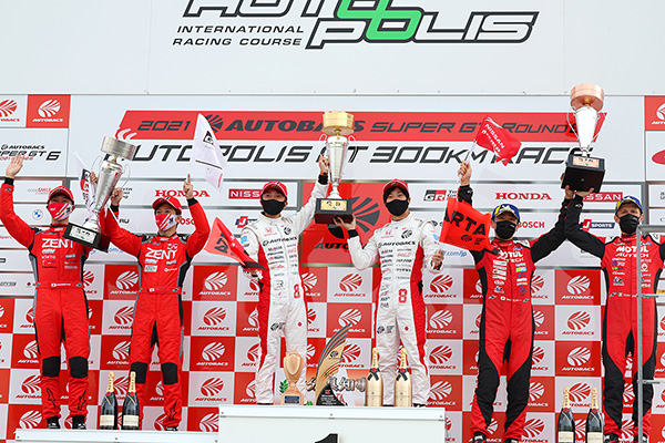 2021 AUTOBACS SUPER GT第6戦『AUTOPOLIS GT 300km RACE』の決勝レースが10月24日(日)午後、大分県のオートポリス(1周4,674m×65周)で行われた。GT500クラスは、予選4位からスタートしたNo.8 ARTA NSX-GT(野尻智紀/福住仁嶺)が後半に独走態勢を築いて今季初勝利を挙げた。GT300クラスはNo.31 TOYOTA GR SPORT PRIUS PHV apr GT(嵯峨宏紀/中山友貴)が見事なポール・トゥ・ウインを決めた。