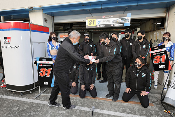 【受賞理由】 GT300クラスポールポジションからスタートし、荒れたレースにもかかわらず他を寄せ付けずにクラス優勝を果たした31号車TOYOTA GR SPORT PRIUS PHC apr GTチームのみなさんにお贈りしました。完璧なレース運営によってチームに5年ぶりの優勝をもたらしました。
