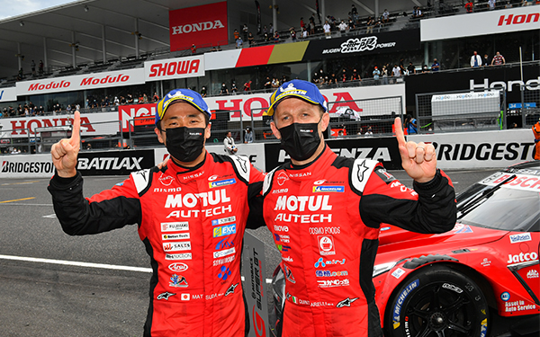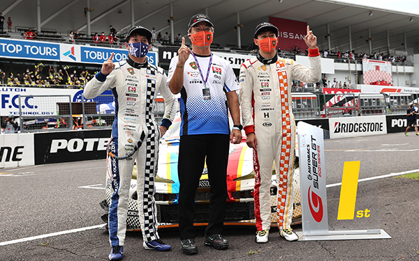 まず、いろいろな方々の努力のおかげで新型コロナウイルス禍の中でもこうして無事にSUPER GTが開催されたことに感謝しています。今回は(三重県出身の)僕にとっては地元の鈴鹿でのレースでしたが、前戦のもてぎを終えてからもしっかりトレーニングをやって、今回のレースに向けてコンディションを整えてやってきていましたので、プレッシャーもありましたが自信もありました。実際、公式練習ではトップタイムを出せて、予選でも3位になり、レースの前半でもロニー(クインタレッリ)選手が良い走りを見せていました。その後のピットの作戦が若干失敗したなという感じはあったんですけど、それでも4番手から挽回していくことができました。クルマとタイヤが本当に良かったです。また、チームのみんなの『勝ちたい』という気持ちが僕の走りにつながったと思うので、本当にみんなに感謝しています。僕もロニー選手も、まぁまぁ年齢はいってるんですけど(苦笑)、お互いに高め合って、いい感じで強くなってきているように思いますし、もっともっと強くなれるようにこれからもやっていきたいと思っています。