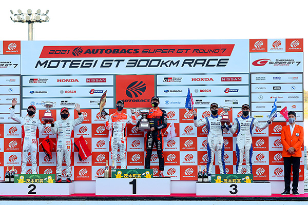 2021 AUTOBACS SUPER GT第7戦『MOTEGI GT 300km RACE』の決勝レースが11月7日(日)午後、栃木県のツインリンクもてぎ(1周4,801m×63周)で行われた。GT500クラスは、最終ラップに劇的な逆転が起こりNo.8 ARTA NSX-GT(野尻智紀/福住仁嶺)が連勝を飾った。GT300クラスは、予選5位からNo.21 Hitotsuyama Audi R8 LMS(川端伸太朗/篠原拓朗)が優勝を決めた。