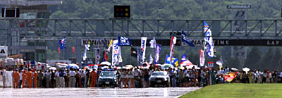 全車がスターティンググリッドにつき、14時30分の予定通りにローリングが始まり、1周でスタートとなった。ポールポジションのNo.38 FK/マッシモセルモスープラの竹内浩典は、背後に迫るNo.39 デンソーサードスープラのファーマンを抑えきって1コーナーに進入し、トップを守る。その後ろにはNo.6 エッソウルトロンタイガースープラの野田英樹、No.36 カストロール・トムス・スープラの土屋武士と予選通りにスープラが並ぶ。この背後にはNSX勢のトップであるNo.8 ARTA NSXの鈴木亜久里が5番手につける。トップのNo.38 FK/マッシモは2番手のNo.39デンソーを少しずつ引き離し、6周終了時には3.5秒の差を付けた。だが、9周目に1台のスピンから連続してスピンが発生、中でもNo.21 ZEROマクラーレンGTRがヘアピンでウオールに激しくクラッシュしたためにセーフティカーが入って、7ラップに渡ってのパレードラップとなった。16周目にレースが再開。この再スタートでもNo.38はトップをキープ。またもやNo.39を引き離していったのだが、17周に突如ヘアピン付近で、エンジントラブルからスローダウン。竹内も何とか走らせようとしたが、結局ダンロップコーナーでストップし、早くもポールシッターがレースから姿を消した。