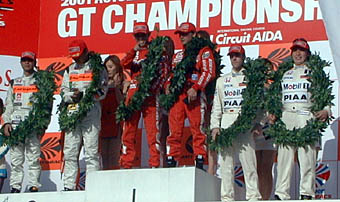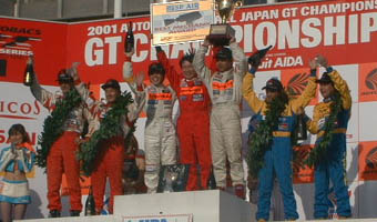 ![]() ■決勝レースレビュー ![]() 激しいレースをチャンピオンが制する! ロックタイト無限NSXがプライド示すポール・トゥ・ウィン GT300はARTA・アペックスMR-Sが世紀をまたいでの連勝 ![]() 今世紀最初のJGTCが開かれた週末。勝負を司る女神は、昨年少し意地悪をしたチャンピオンに、お詫びのご褒美をあげたかのようだった。 4月15日、好天に恵まれた岡山県・TIサーキット英田でAUTOBACS CUP全日本GT選手権(JGTC)開幕戦の決勝レースが行われた。 午後2時ちょうど、気温23度、路面温度32度、快晴のという好コンディションの中、定時に決勝レースがスタート。ポールのNo.1 ロックタイト無限NSXのスターティングドライバーとなったのは、光貞秀俊だった。好スタートを決め、リーダーポジションを守ったまま1周目を終えた光貞だったが、その背後には牙をむき出しにしたライバルたちが迫っていた。ことにチャンピオン奪還を狙い、この決勝に自信を持っていたNo.23 ペンズオイルゼクセルGT-Rのエリック・コマスと、同じNSXユーザーであるNo.64 Mobil 1 NSXのドミニク・シュワガーのアタックは強烈を極めた。序盤は3台がテール・トゥ・ノーズでしのぎを削る闘いが続く。そして9周目に周回遅れに掛かる隙をコマスに突かれ、光貞は首位を明け渡した。 ■チャンピオン・チームの自信あるレース展開 だが、光貞はまったく動じていなかった。それには訳がある。彼は予選をエースの道上龍に任せ、TI入りしてからは決勝で闘えるマシン・セッティングだけをチーム・スタッフと練り上げていたからだ。「あそこはしょうがなかった。無理すれば周回遅れを飛ばしてしまうかもしれなかったし。抜かれてもコマスと自分のスピードは変わらなかったから、チャンスは必ずあると思っていた」。その光貞の言葉通り、チャンスは20周目に訪れた。コーナーでコマスの背後に着いた光貞はバックストレッチで並び掛ける。そしてGT-Rの真横に出たときだった。彼の進路には他車の落とした破片があった。「行くしかない!」。幸いにもはじき飛ばした破片でダメージを受けることはなかった。これは、勝負の女神のひいきだったのかもしれない。一方で、同じ破片を踏んだNo.64 Mobil 1 NSXはブレーキ冷却ダクトにこの破片の一部が張り付き、終盤ブレーキパワーの低下で苦しむことになったからだ。 これで首位を奪い返した光貞は、再度守る立場になるかと思われたが、今度はコマスが苦しむ立場となった。首位から陥落したとたん、GT-Rのラップタイムが一気に落ち始める。左リアタイヤにトラブルが起こったらしく、マシンの挙動が安定しない。このままペンズオイルゼクセルGT-Rは首位戦線から脱落し、2度と上位争いに加わることはなかった。僚友の脱落と入れ替わるように、首位争いに加わったのはNo.22 ザナヴィヒロトGT-Rのミハエル・クルムだ。マシンは好調というだけに、前をゆくNSXにぴたりと付いていく。序盤のトップ争いはNo.1、No.64そしてNo.22が展開していく。 ■予選10位から大躍進のARTA NSX この上位陣のつばぜり合いを後目に、後方から追い上げるマシンが3台あった。まずは、予選10位のNo.8 ARTA NSXの金石勝智だった。「予選での問題は分かっていたから、決勝は大丈夫」という言葉通り、着実に順位を上げていき、23周目には3番手となった。そして、No.100 RAYBRIG NSXの伊藤大輔のペースも凄まじかった。伊藤はスタート直後に中段で起こったクラッシュに巻き込まれ、1周目を終えた時点ではGT300よりも後ろの31番手まで後退してしまった。そこから猛然と巻き返す。5周目にはこの日のファステスト・ラップ(1'28.747)を記録して、33周目には5番手にまでポジションを復帰させる。 また、この決勝での勝負に自信を持っていたのがNo.38 auセルモスープラだった。スタートドライバーを努めた竹内浩典は、ハード目のタイヤを選択し、序盤は無理せず上位陣がタイヤを痛めるころに巻き返す作戦だった。それはほぼ目論み通りに進み、32周目には4番手に浮上。さらに表彰台圏内に入ってから、次の立川祐路にトップ進出を託す予定だった。だが、彼らには勝負の女神はつれなかったようだ。37周目の最終コーナー入り口で突如マシンがコントロール不能になり、スピンしながらコースアウト。マシンはひっくり返った形でグラベルに止まった。一瞬、冷や汗を感じるアクシデントだったが、竹内は自力でクルマから脱出して事なきを得た。だが、彼らの勝負ここですべて終わってしまったのだった。 No.38のアクシデント処理のため、37周から41周までペースカーの先導によるパレード・ラップとなり、トップをいくNo.1 ロックタイト無限NSXを始め、この機会にと各車が続々とピットに入る。このため、このレースではピットワーク勝負はさほどポイントにはならずに後半戦へと突入した。 後半戦、勝利を争うこととなったのはトップのロックタイト無限NSXの道上、そしてARTAのドリキンこと土屋圭市の2台のNSX、そしてザナヴィヒロトGT-Rの田中哲也だ。 だが、ここから