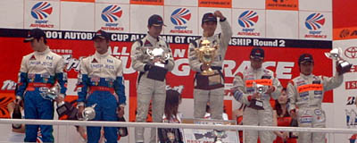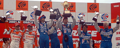 だが、この時にNo.3の右フロントホイールにトラブルが生じ、緊急ピットイン。幸いSCラン中だったため、素早くタイヤを交換することでこれ以上順位を落とさず、コースに復帰できた。レース再開後もNo.81 ダイシンADVANシルビアはトップを譲ることなくゴール。これでダイシンは念願のJGTC初優勝を飾った。2位はNo.3 ユニシアジェックスシルビア、3位には1ピット作戦という作戦に出たNo.31 ARTA・アペックスMR-Sが入った。 ![]() GT500 Winner No.6 エッソウルトラフロー スープラ 脇阪寿一「スタートは無理な加速はしたくなかった。1コーナーで混乱にならないように、自分のポジションが下がってもいいと思っていた。3番手に落ちたけど、無理せずに行きました。それにピットでひっくり返せると確信してたから。そのあとも野田さんがいい走りをしてくれて、20秒近くも離してくれましたから。あとはクルージングです。とにかくメチャうれしいですよ。フォーミュラでも速いところは見せられても勝てないし、TIも。クルマはいいものを与えてもらっているのに、これで勝てなきゃ(ドライバー)辞めますよ…。って辞めないだろうけど(笑)」 野田英樹「ピットのタイミングは38号車より後にしようと相談してました。それなら絶対前に出れると思ってました。運良く向こうもがエンストですか、ミスしてくれたので、かなり楽させてもらいました。今後は勝てるところで確実に勝って、ポイントを取るところでしっかり取り、確実にポイントを重ねて行きたいです」 ![]() GT300 Winner No.81 ダイシンADVANシルビア 青木孝行「スタートで後続をはなせたんですが、タイヤが早くタレてしまいました。あとは(3号車が)見えるところについていって最後10ラップくらいに、エンジンの設定変更という奥の手で…、と思ったんですけど、むこうがトラぶったようですね。それがなければ最後に面白いレースになったんじゃないですか(笑)。ボクも待ってたんですけど(笑)。(初優勝ですが?) 勝ったって実感がすぐには沸きませんでしたね。これまでいいところで逃していたから、ホントに勝ったのかなって(笑)」 大八木信行「昨日もここで話しましたが(PP会見で)、今日は昨年の夏の雪辱、その思いだけでした。日産さん、ニスモさんに協力してもらい、いいものを提供されているのに、これで勝てなかったから、脇阪君じゃないけど、ボクも辞めなきゃね(笑)。レースはとにかく3号車の見えるところで、いい状況を保って行こうと思ってました。あとは最後を任せればと」 ![]()