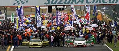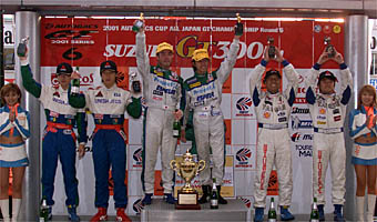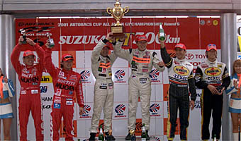 ![]() ■決勝レースレビュー ![]() auセルモスープラはしぶとく6位入賞でランキング1位を堅持 GT300はプロジェクトμ・エスペリアMR-Sが初優勝を飾る ![]() 10月16日、鈴鹿サーキットでAUTOBACS CUP全日本GT選手権第6戦SUZUKA GT300kmの決勝レースが行われた。天気予報は降水確率70%とと言われていたが、決勝直前のウォームアップ時に雨がパラついただけで、決勝レースは気温20度、路面温度21度のドライコンディションで行われた。 ローリングスタートのためのフォーメーションラップで、スタート前に隊列が整わなかったために、フォーメーションが2周追加され、決勝レースは49周で争われる形になった。 ![]() スタートは、やや出遅れたポールのNo.8 ARTA NSXの金石の背後に、後続が大きく広がる形になり、大外を回った予選7位のNo.6 エッソウルトラフロースープラの野田が一気に前に飛び出し、1コーナーを制した。トップに立ったエッソスープラの後ろには、ARTAとNo.1 ロックタイト無限NSXの光貞がピタリとつけ、この3台が序盤激しい闘いを展開する。特にエッソの野田とARTA金石はテール・トゥ・ノーズで競り合い、半歩引いてロックタイト無限の光貞がうかがうという状況。これが動いたのは9周目。勝負を仕掛けARTA NSXのノーズが、エッソスープラのテールをヒット。これでエッソはコースアウトし大きく順位を下げた。これで、トップ争いはNo.8 ARTA、2番手No.1 ロックタイトのNSXが競り合う。 3番手はNo.22 ザナヴィヒロトGT-Rのクルム、No.23 ペンズオイルゼクセルGT-Rのコマスと、スカイラインが並ぶがザナヴィGT-Rも9周目に他車と接触し、フロントを壊して後方に下がってしまう。これでペンズオイルと、そしてNo.39 デンソーサードスープラGTのデュマとNo.100 RAYBRIG NSXの飯田章、No.37 マツキヨZENTトムススープラの山路、No.36 カストロール・トムス・スープラの黒澤と争う。 この中でNo.100 RAYBRIG NSXは伊藤へドライバー交代後に周回遅れと絡み、左前の足回りを壊して、デンソースープラはスタート時のフライングでペナルティ・ストップで脱落。 そして、ピットストップのタイミングでNo.36 カストロール・トムス・スープラ(土屋武士)が3番手に上がり、4番手にペンズオイルGT-R(影山)、5番手にマツキヨスープラ(ガードナー)の順に。そして、予選12位に沈んだランキングトップのNo.38 auセルモスープラ(竹内>立川)も7番手まで浮上する。 一方、トップの攻防戦はARTAの金石が、2番手ロックタイトの光貞を15秒近く離して、ピットイン。そして、第2ドライバーの土屋圭市(ARTA)、道上(ロックタイト)の闘いへともつれる。 開幕戦ではトップを行くロックタイトの道上が追う土屋を振りきって優勝。このことから、終盤に接戦となると予想されたが、ここで土屋の闘争心に火が点いた。まして、この鈴鹿ではARTA NSXは絶好調。土屋は、時に2分3秒台を叩き出し、4秒前半が精一杯の道上を徐々に引き離していく。 ARTA NSXはこのまま背後を脅かされることなく、チェッカーフラッグを受けて今季初優勝を飾った。表彰台最後の席の争いは、カストロールスープラがリードしていたが終盤、燃料系にトラブルを生じペースダウン。これで、ペンズオイルゼクセルGT-Rが入った。 チャンピオン争いでは、このレース前までランキングトップのauセルモスープラ(竹内・立川組)はしぶとく走りきって6位に入賞58ポイントとし、かろうじてトップの座を守る。優勝したARTA NSX(土屋・金石組)と2位に入ったロックタイト無限NSX(道上・光貞組)がそろって56ポイントとして、auコンビとわずか2ポイント差。また、ザナヴィヒロトGT-R(クルム・田中組)もわずか3ポイントだが稼いで、46ポイント。マツキヨZENTトムススープラ(山路・ガードナー組)が44ポイント。 この展開で、最終戦MINE(11月10、11日)を迎えることとなった。 ![]() GT300クラスは、3周目にポールのNo.81 ダイシンADVANシルビア(青木)が、予選2位のNo.0 Netz BP Kosei MR-S(松永)にかわされる。これで序盤はトップNetz MR-S、2番手ダイシンアドバン、以下にNo.7 雨宮マツモトキヨシアスパラRX7(山野>松本)、No.3 ユニシアジェックスシルビア(井出>柳田)、No.31 ARTA・アペックスMR-Sと選手権上位ランカーが並び、その後ろのNo.77 クスコスバルインプレッサ(谷川)、No.86 プロジェクトμ・エスペリアMR-S(松田晃司>長島)までが1列縦隊で争う。 この上位陣に次々とアクシデントが襲い、ランキング1、2位のダイシンと雨宮が相次いで他車と接触してマシンを壊す。結局、ダイシンはリタイア、雨宮も完走は果たすがポイント圏外に終わった。この2台が脱落して、トップ争いはNetz MR-SとARTA MR-Sとなるが、今度はこの2台がテグナーで揃ってスピンアウト。さらにGT500マシンもスピンし運悪く止まっているARTA MR-Sとクラッシュ。これでARTA MR-Sはリタイア。これで、なんとランキング上位3台がノーポイントとなった。 これで、トップに立ったのはクスコインプレッサだったが、こちらも他車と接触。そして最後はターボにトラブルが出てリタイヤ。 これで、終盤のトップ