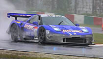 そして残り23分にNo.8 ARTA NSX(土屋圭市/金石勝智組)が15秒054を出す。だが、残り4分でNo.100 RAYBRIG NSXは15秒047を叩きだし、残り1分でさらに14秒109を、そして最後のアタックで13秒402をモニターの最上段に刻む。これでこのセッショントップを決めた。2番手にはNo.8 ARTAの14秒848、3位にはNo.18 TAKATAの15秒808と、ウェット状態の鈴鹿でNSXがトップ3を占めた。4位には他の国産GTを退け、No.21 イエローコーンマクラーレンGTR(服部尚貴/中谷明彦組)が2分15秒854で入った。