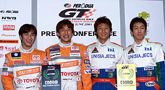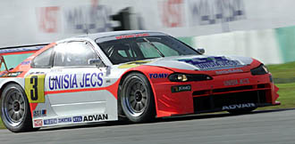 ![]() スーパータイムも不満の立川… GT300はセパン初挑戦のユニシアジェックスシルビアが1位に ![]() 6月23日、16時10分。予定通りに2001 JAPAN GT RACE Malaysian Roundの予選2回目がスタートした。日本の感覚だと午後4時を過ぎれば夕方という感じだが、マレーシアではまだまだ日ざしは十分にある。気温も30度を超えたままだ。 予選2回目もシリーズ戦同様に、両クラス混走、GT300占有、GT500占有が各20分ずつとうセッションになる。この混走セッションでトップに立ったのは、燃料系のトラブルで予選1回目を走行できなかったNo.8 ARTA NSXだった。タイムは2分1秒864。これにNo.64 Mobil 1 NSX、No.18 TAKATA童夢NSXとNSXが並ぶ。 そしてGT500占有セッションに入るが、1回目同様に序盤は各車が無理のない走行に終始する。そしてラスト10分となると、アタックが開始された。 ラスト7分過ぎに、まずNo.21 イエローコーンマクラーレンGTRが2分1秒018でトップとなる。これがタイムアップ・ショーの幕開けだった。 ラスト5分になると、No.100 RAYBRIG NSXが2分0秒383と0秒台に入れてトップを奪うが、ここからめまぐるしく上位の名前が変わっていく。1分も経たないうちにNo.64 Mobil 1 NSXが1分59秒954とこの2回目最初のアンダー2分となる。だが、即座にNo.18 TAKATA童夢NSXが59秒875を叩き出してNo.64から首位を奪う。 だが、これでもトップ争いは終わらない。ラスト3分を回ったところで午前中2位に甘んじたNo.38 auセルモスープラの立川祐路が1分59秒184と、暫定ポールタイムをも上回るスーパーラップを決めてトップに立つ。 このタイムをうち破るべくラスト2分で勝負を掛けたのがNo.22 ザナヴィヒロトGT-Rのミハエル・クルムだ。クルムも59秒574を出すが、わずかに及ばず2番手。そしてチェッカー直前にNo.6 エッソウルトラフロースープラの脇阪寿一もアタックをするが、59秒708と、自らの午前の暫定ポールタイムも上回れずに3番手に終わった。これで予選は終了。 この結果、ポールポジションはNo.38 auセルモスープラとなった。2位にはNo.6 エッソウルトラフロースープラとフロントローにスープラが並ぶ。この後方に、No.22 ザナヴィヒロトGT-RとNo.18 TAKATA童夢NSXとスカイライン、NSXがピタリとつけることになった。No.88 ノマドディアブロJGT-1はマシンの修理が間に合わず、結局予選を1度も走行する事が出来なかった。 ![]() 占有セッションに入って7分過ぎにクラス暫定ポールのNo.3 ユニシアジェックスシルビアの井出祐路が2分11秒628を出して、この2回目でもトップに立つ。井出はさらに11秒319までタイムを刻む。最終的にこのタイムがこの予選2回目のクラス1位となるが、午前の自らのタイムに及ばなかった。 占有セッション中盤にNo.31 ARTA・アペックスMR-Sも11秒867と午前以上のタイムを出して2番手。だが、占有セッション終了直前にNo.77 クスコスバルインプレッサの2分11秒795でNo.31をかわして2番手になった。 予選2回目の結果は、1位No.3シルビア、2位にNo.77、No.31となった。予選1回目に2位のNo.900 MT900Rはエンジンにトラブルがあって、結局2回目は走行できなかった。 予選総合結果としては、GT300クラスポールは、ドライバー2人ともにセパン初挑戦のNo.3 ユニシアジェックスシルビアが獲得。2位にはNo.900 MT900Rで、JGTCでのベストリザルトとなる。3位にはNo.77 クスコスバルインプレッサ、4位No.31 ARTA・アペックスMR-Sとなった。 明日の決勝レースでは、この予選上位1、2、3位にウエイトハンディが搭載される。GT500クラスでは、1位のNo.38 auセルモスープラに50kg、2位のNo.6 エッソウルトラフロースープラに30kg、No.22 ザナヴィヒロトGT-Rが20kgとなる。GT300では、No.3 ユニシアジェックスシルビアが30kg、No.900 MT900Rが20kg、No.77 クスコスバルインプレッサが10kgとなる。 ![]() No.38 auセルモスープラ 立川祐路「(ポールを)獲っちゃいました。竹内さん、あとはよろしくお願いします。アタックは、裏ストレート手前とS字でミスっています。竹内さんは"(ポールを獲りに)いくな"って言うし、(佐藤正幸)社長は"いけ"って言うし、ボクの気持ちもちょっとアタック全開モードになっていませんでした。それでミスしたので、ちょうど2〜3番手だと思ったんですけど。6号車がなにも考えずに(笑)もっと来るかと思ってたましたしね」 竹内浩典「オレは明日、もう18周でピットに戻ってくる(笑)。50kg積んだら富士の練習にはなると思うけど、ここではけっこう効くんじゃないかな。レースでは(後続を抑えて)スクールでも作りましょうか」 ☆GT300ポールポジション No.3 ユニシアジェックスシルビア 井出有治「(明日は)勝ちたいです。今回初めてここに来たんですけど、そうとう辛いと聞いているので、覚悟してやりたいと思っています」 柳田真孝「(レースは過酷になりそうだが早く寝るか?)いや、今日は井出さんに連れられて街に行く予定です(笑)。いえ嘘です、早く寝ます(笑)。(ライバルは、どこになりますか?)午前のタイムでは上位3台くらいが非常に接近していますから、やはりNo.900のモスラーと、No.31でしたっけ、MR-Sが気