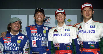 追うNo.31は、序盤のスピンで大きく順位を下げたが、そこから新田守男がハードなドライビングで3位までにリカバリー、そして最終ラップには後を引き受けた高木真一がNo.77 インプレッサのま横まで迫った。そして最終コーナーでなんと2台は接触! リカバリーの早かったNo.77 が辛くも2位でフィニッシュ。3位にはNo.31が入った。 予選2位だったNo.900 MT900R(D.マラガムワ>バルボーザ)は序盤に遅れ、結局クラス5位。旧RE雨宮RX7を使って参戦したNo.65 AMPREX elf RX-7はわずか6周でギアトラブルのためリタイアとなった(最終的にはフライングスタートで失格扱い)。 ![]() GT500 Winner No.6 エッソウルトラフロー スープラ 脇阪寿一「昨日はポールをねらいにいったけど獲れなかったので、ウェイトハンディの20kg差を活かして前に出ようと思ったんですが、No.38のペースがよかったんで後ろについていくことに作戦を変えました。ぴったり後ろについていけばピット作業で逆転できると思ったんで。でもGT300のクルマに詰まったりしてうまく差を詰められませんでした。野田さんにしんどい仕事を残してしまったんで、あとはボクとしては祈るだけでした」 野田英樹「ピットでメカニックがいい仕事をしてくれたんで(No.38の)前に出ることができました。しばらくしたらブレーキにトラブルが出て、何度も飛び出しそうになりました。そのうちラップ遅れに詰まってNo.38に抜かれたんですが、まだレースは長いしチャンスはあるだろうと思ってプッシュし続けました。結果的に勝てたのは、チームワークと、最後まであきらめなかったためだと思います。トップ争いをしているときに、スタンドのお客さんが総立ちで声援を送ってくれたのがすごくうれしかったです。思わずスタンドを見ちゃいました」 GT300 Winner No.3 ユニシアジェックスシルビア 井出有治「クルマはちょっとバランスが悪かったですね。でもほかのチームよりはよかったんだと思います。序盤はタイヤを温存するために(2分)15秒キープで走っていました。交代する10周前くらいからプッシュしたら後ろが少しずつ離れていって、30秒くらいのマージンがある状態で柳田に渡せました。タイヤをうまく使えてよかったです。30kgのウェイトは多少クルマのバランスは変わりましたけど、なんとかふつうには走れました」 柳田真孝「サーキットに来る前にふざけて口にドリアンアイスを突っ込まれたら、差し歯が折れちゃったりして、いろいろツイていないことがあったんですけど…。勝ててよかったです」