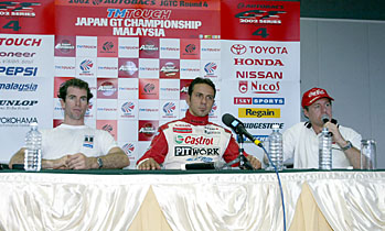 セッション序盤に午前も好調だったNo.64 Mobil 1 NSXのファーマンが2分00秒445とついに00秒台に入れて、トップとする。これにNo.1 auセルモスープラが01秒189で続く。 セッション終盤にNo.18 TAKATA童夢NSXが01秒187を出して2番手まで上がってくるが、結局、Mobil 1 NSXには届かない。だが、これでNSXがこのセッションの1−2となった。この後にauセルモスープラを挟んで、No.16 無限NSX、No.8 ARTA NSX、No.100 RAYBRIG NSXと続き、このセッションもNSXが速さを示した。 セッションも残り2分を切ったところで、スピンしてコース上でストップしたマシンが出たために、走行が中断。走行時間としては1分ほど残っていたが、このまま終了となった。 午前の走行と合わせての総合トップはNo.64 Mobil 1 NSX、2位がTAKATA童夢NSXとなった。だが、この日のトップタイムは、昨年に立川祐路(auセルモスープラ)が記録したポールタイム(コースレコード)1分59秒184に届かずに終わった。理由としては、コースコンディションがいまひとつだったようだ。セパンはレースの開催回数が少ないため、コースはややダスティな状況で、ホコリが飛び、路面にゴムが乗ってくるまではペースが今ひとつという感触を多くのドライバーが訴えていた。 GT300では、序盤にNo.7 雨宮マツモトキヨシアスパラRX7が2分11秒790と、早くも午前のベストを上回る。そして、No.62 Vemac R&Dダンロップ320Rも11秒249を記録して、最上位を入れ替える。No.3 ユニシアジェックスシルビアも11秒266まで詰めて、Vemacに続く。このまま、上位陣で終わるかに思えたが、終盤にNo.2 BOSSベルノ東海AR・NSXの渡辺明が2分11秒100を叩き出して、一気にトップに立つ。結局、このままセッションが終了し、BOSSベルノ東海AR・NSXが今日のクラス総合トップとなった。 ![]() また、この日のお昼には現地プレス向けにコマス、ガードナー、ファーマンの3人を招いての英語での記者会見が開かれた。決勝への戦略やマシンのこと、セパンの印象などまだレースディではないながら集まった25人ほどのプレスからの質問に答えた。 ![]()