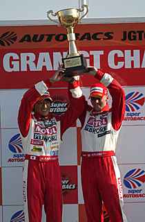 影山正美「(JGTC通算)最多勝ドライバーになったということは光栄です。これからももっと増やしていきたいですね。レースですが、GT500同士はある程度(手の内)読めるのですが、周回遅れ(の処理)が難しかった。エリックさん(No.3)の方が運が良かったみたい。でも、無理して当たってもしょうがない、ぶつからないのが最低限の(勝利への)条件ですから。エリックさんとはいい距離で追えたと思います。これをしのげば何とかなると思っていました。交替してからは、徐々に(勝利の)可能性が高くなるのを感じていましたが、最終コーナーを出てくるまで勝ったという感じはしませんでした。このレースに勝てたのは良かったですが、ウエイトが増えて選手権は厳しいですが、やるだけのことをやって最終戦までいければと思います」